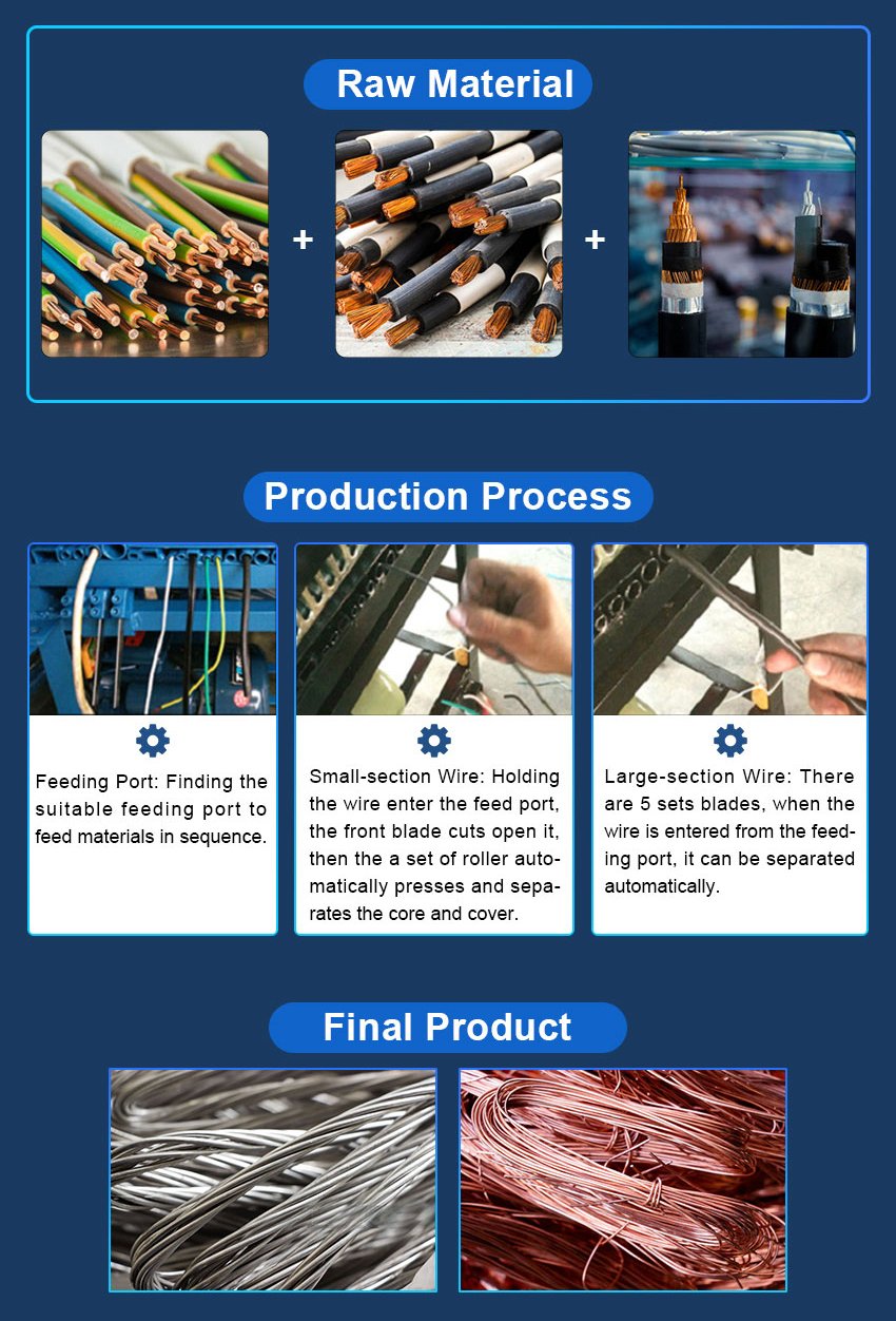 Miracle Wire stripping machines are professional at processing all kinds of scrap copper wires. They’re suitable for processing varieties of cables with diameter in the range of 1mm – 200mm, like electric copper wire, aluminum wire, metal cables and etc, whatever round cable or flat cable, armored or unarmored. what’s more, we can custom suitable machine for you.