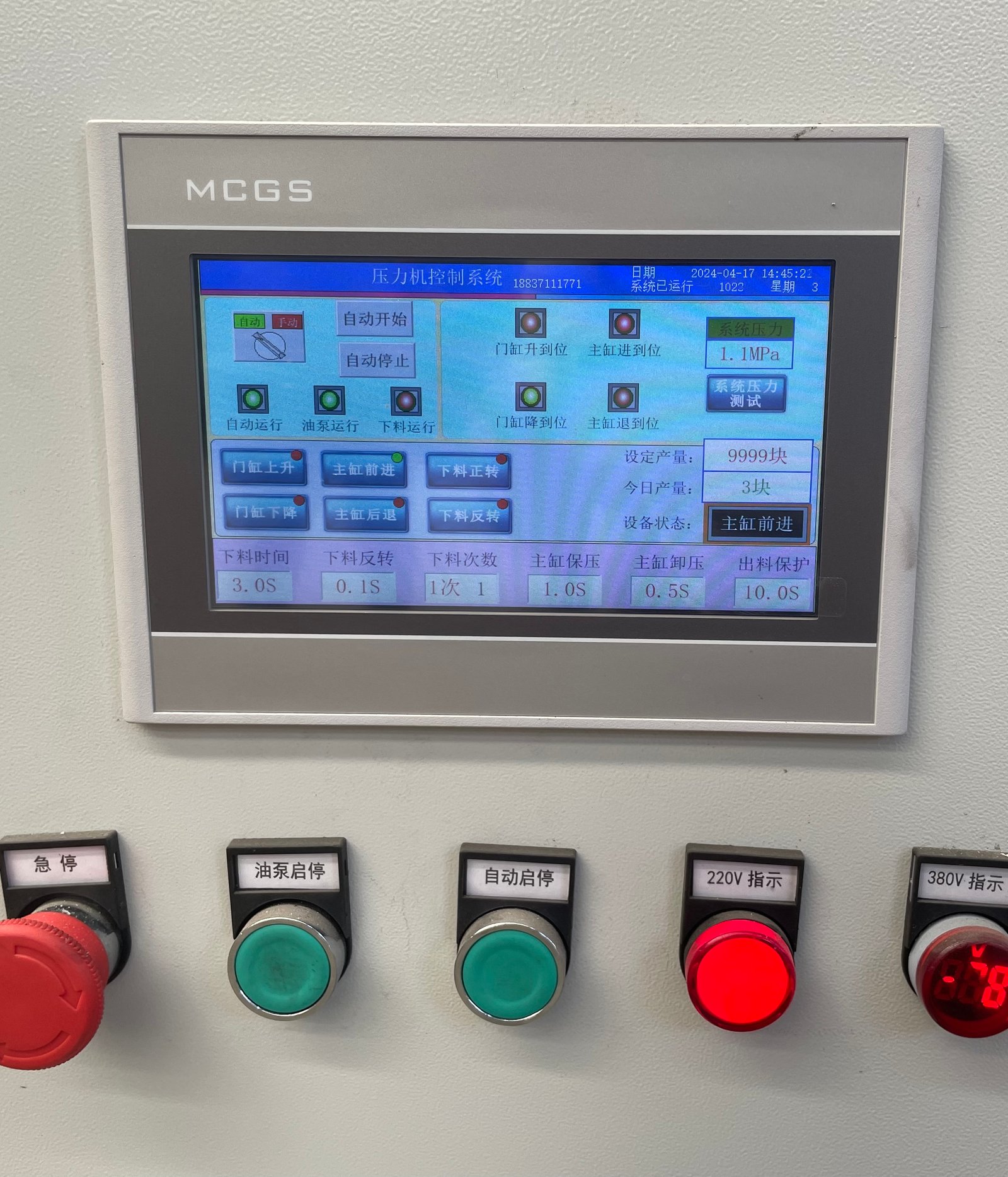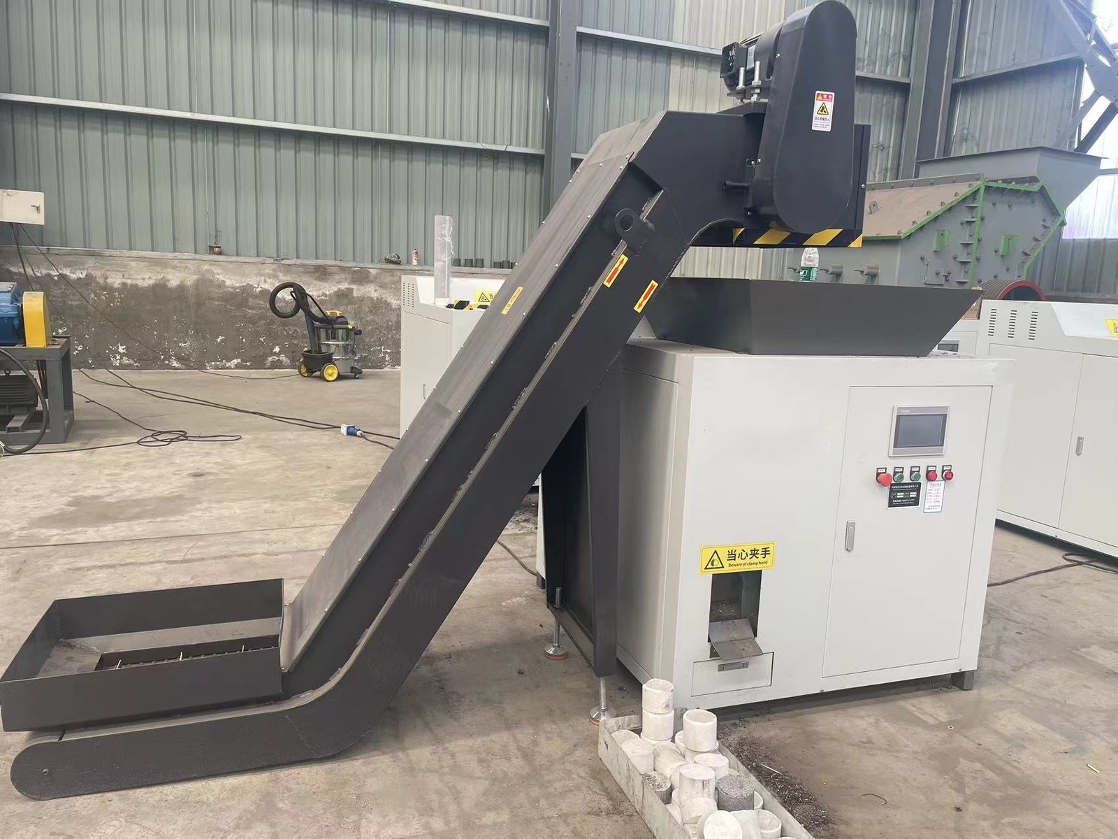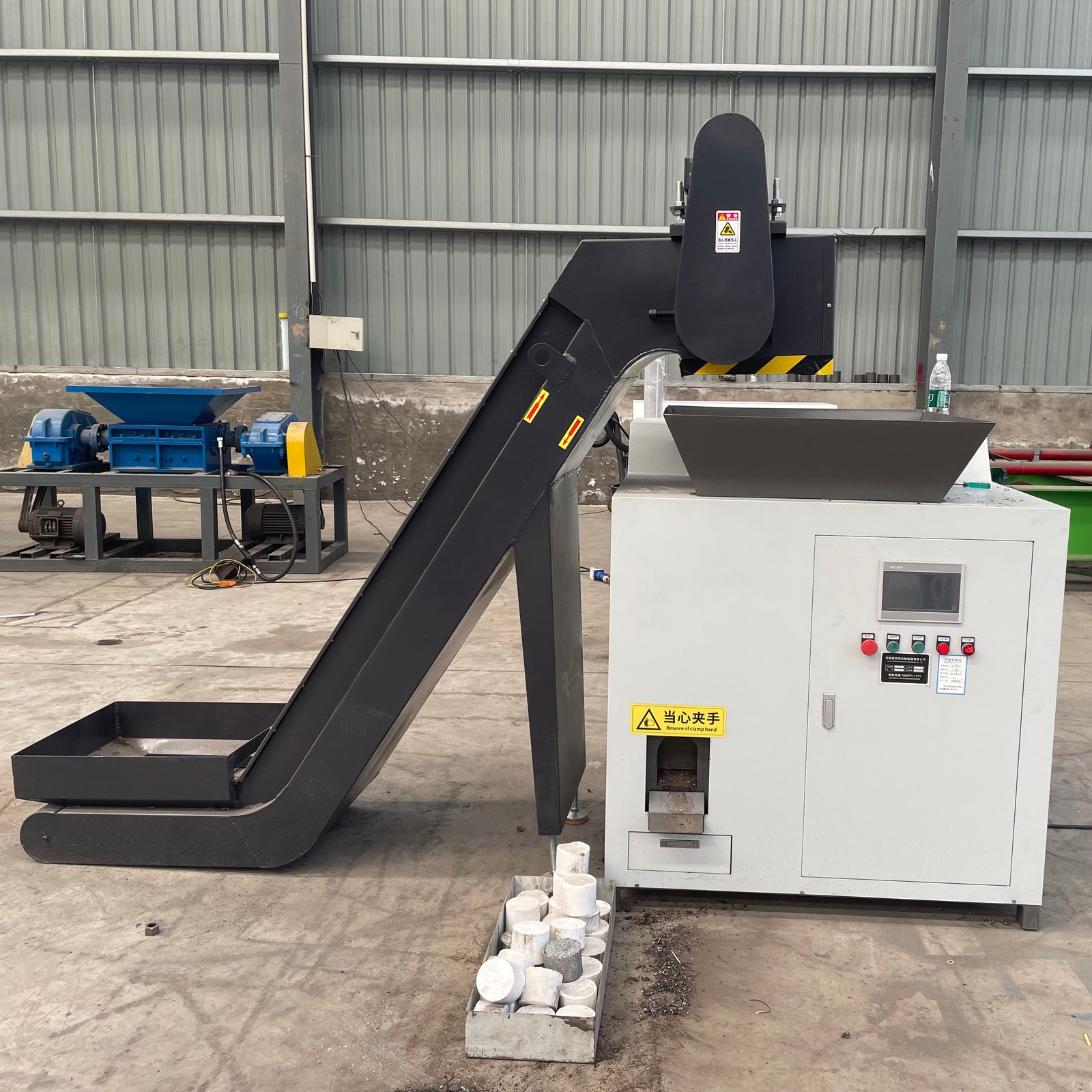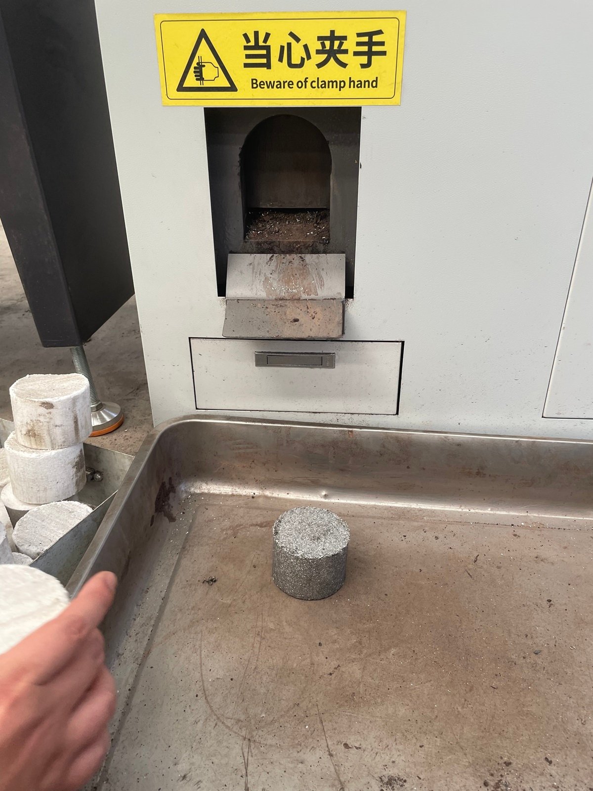 Through the control panel, the scrap metal raw material is placed into the feed port and will emerge from the discharge port in a cake shape after about 20 seconds.